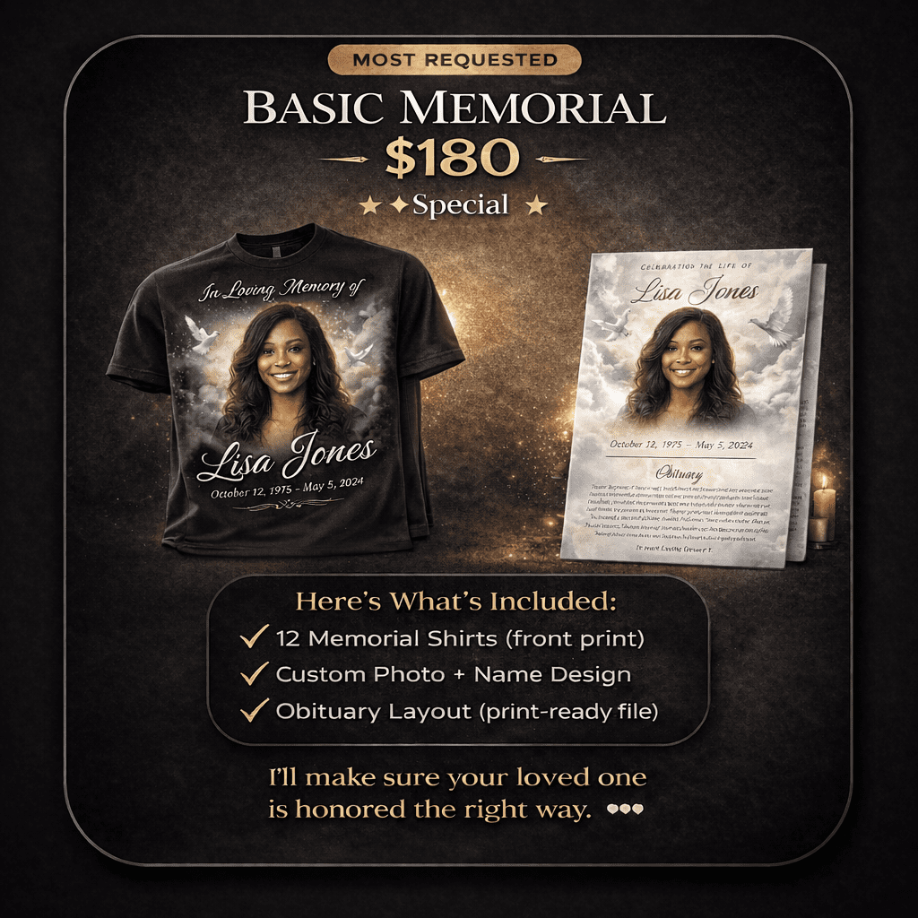 Honor your loved one with a clean, respectful memorial design that’s done right. This package includes custom memorial shirts and a print-ready obituary layout, making it simple to create something meaningful for family and friends.